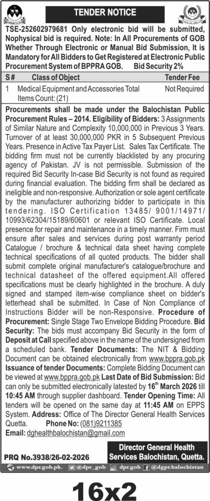 The submission deadline is set for 16th March 2026 at 10:45 AM, with electronic bids only accepted via the supplier dashboard. Tender opening will occur the same day at 11:45 AM on the Electronic Public Procurement System (EPPS). Interested parties can view and download bidding documents from www.bppra.gob.pk. The physical address for correspondence is the Office of the Director General Health Services Quetta.