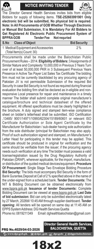 The submission deadline is set for 27 March 2026 at 10:45 AM, with electronic bids only accepted through the supplier dashboard. Tender opening will occur the same day at 11:45 AM at the DG Health Services office in Quetta. Tender documents are available online at www.bppra.gob.pk.