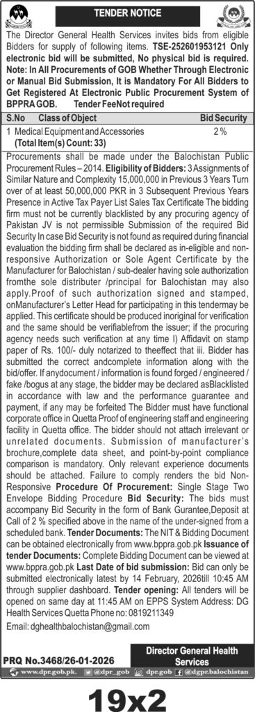 The deadline for electronic bid submission is set for 14 February 2026 at 10:45 AM, with tender opening scheduled the same day at 11:45 AM on the EPPS system. Bidders should submit their bids through the supplier dashboard on the official Balochistan procurement website. The physical address for correspondence is the office of the Director General Health Services, Quetta.