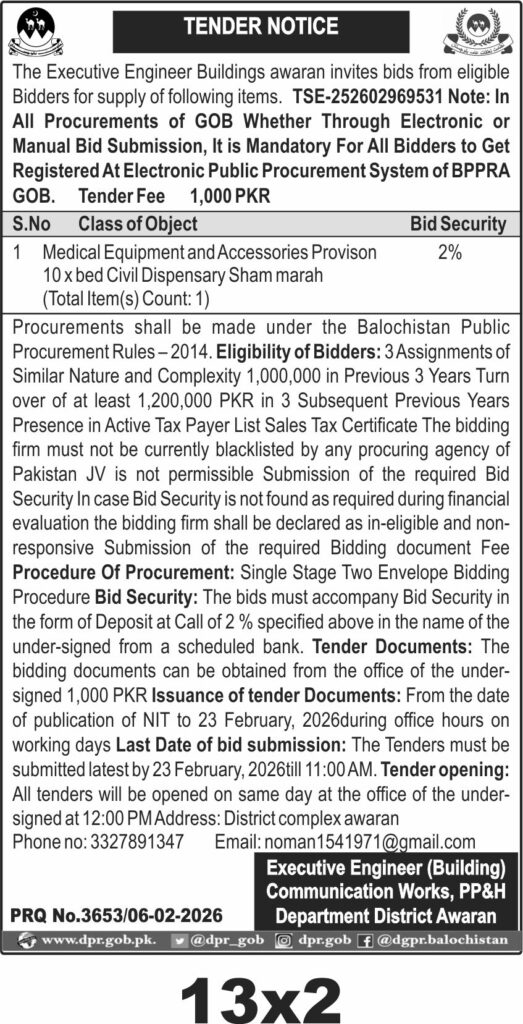 The submission deadline is set for 23 February 2026 at 11:00 AM, with bid opening scheduled the same day at 12:00 PM at the office of the Executive Engineer Buildings, Communication Works, PP&H Department District Awaran, located at District Complex Awaran. Tender documents can be obtained for a fee of PKR 1,000 during office hours until the closing date.