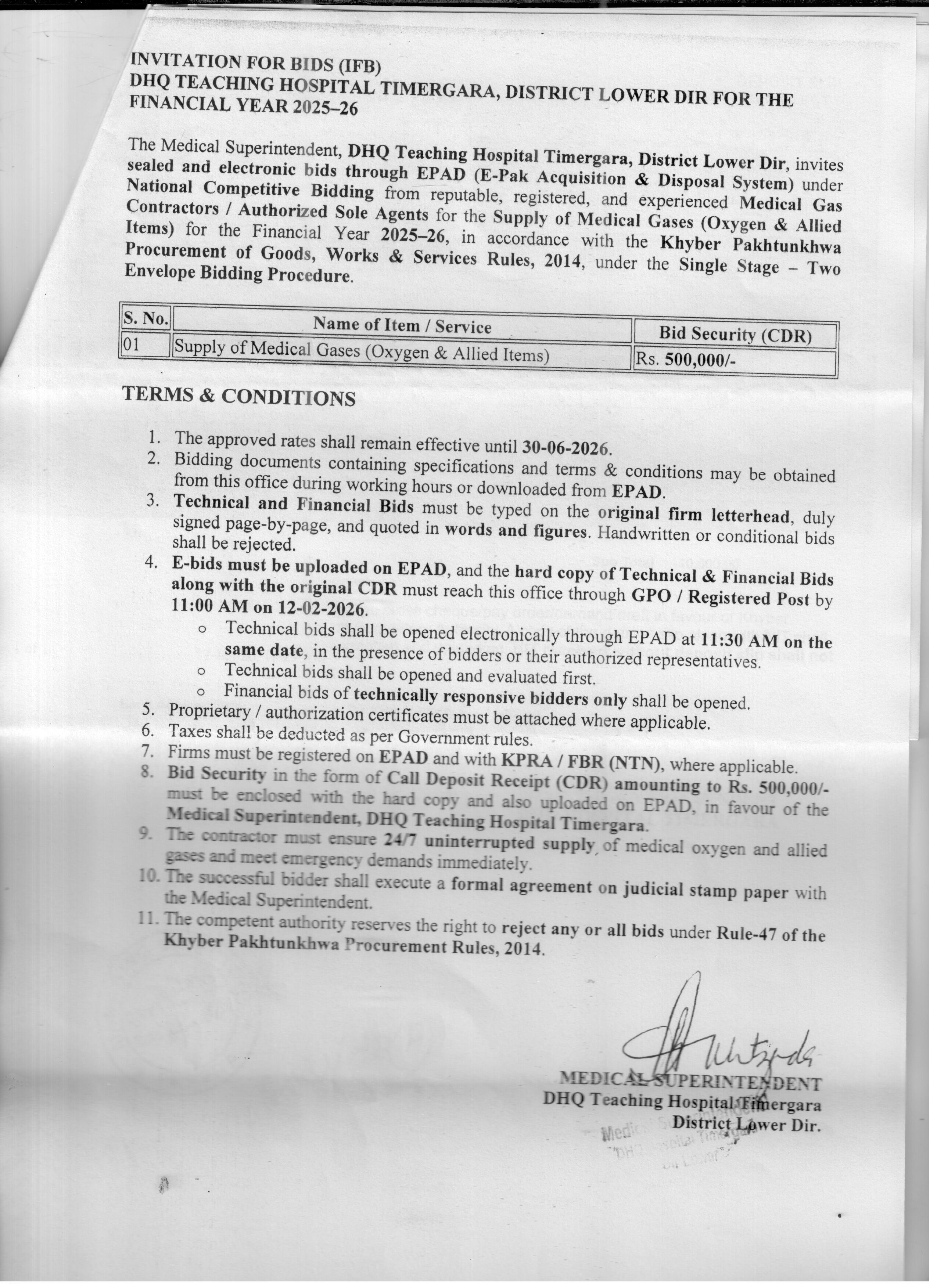 The submission deadline is set for 12th February 2026 at 11:00 AM, with technical bids opening electronically at 11:30 AM the same day via EPAD. Hard copies of bids along with the original CDR must reach the office through GPO or registered post before the deadline. The office address is DHQ Teaching Hospital Timergara, District Lower Dir.