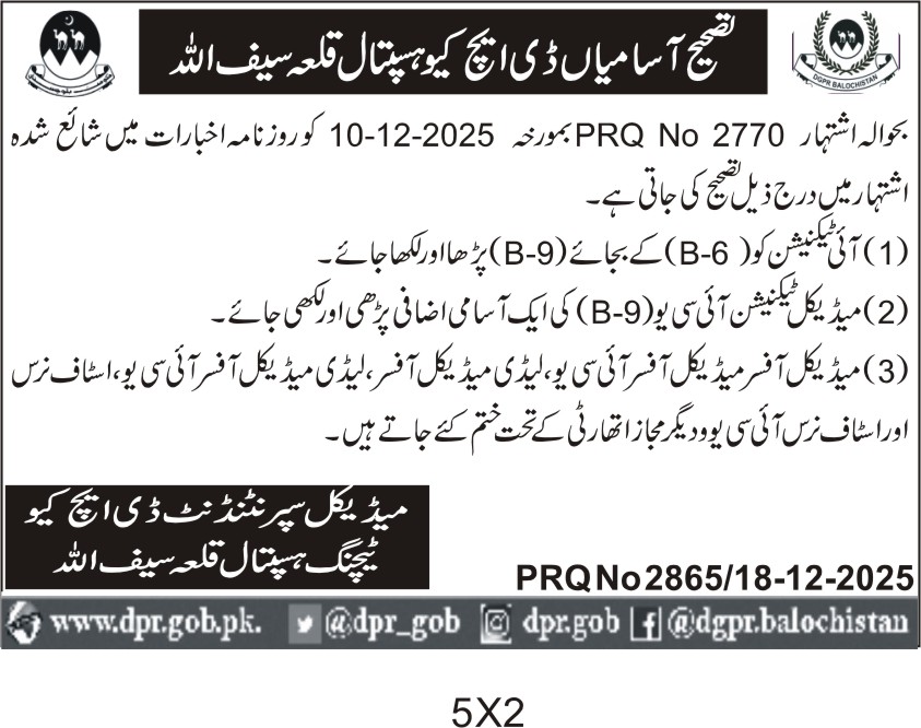 The recruitment includes replacement of IT technician B-6 with B-9 grade, addition of one extra IT technician B-9, and filling medical officer posts in various specialties including medical officer, lady medical officer, and staff nurse. The positions are to be filled under the supervision of the Medical Superintendent DHQ Hospital Qilla Saifullah.