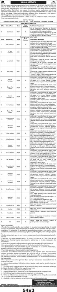 This recruitment drive at Teaching Hospital Kotri, Sindh, invites qualified medical and technical professionals to join various departments. The hospital requires staff including Medical Officers, CT Scan Technicians, Junior Clerks, Store Keepers, and specialized technical personnel. Candidates must meet specific educational and experience criteria, such as recognized medical degrees, diplomas, or certifications relevant to their roles. The recruitment process is designed to ensure the selection of competent individuals to support the hospital's healthcare services.
