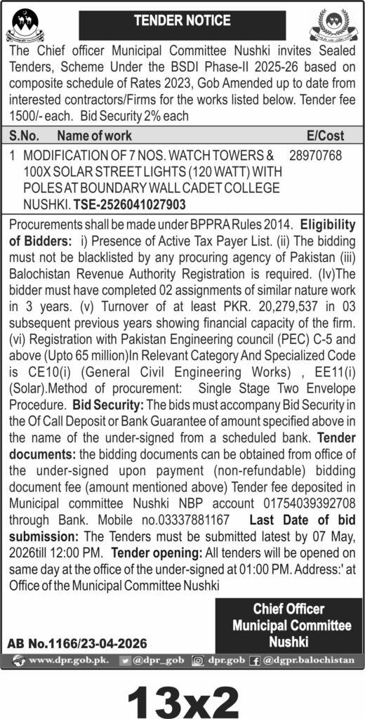The Municipal Committee Nushki is inviting sealed tenders for the modification of 7 watch towers and installation of 100 solar street lights (120 watt) with poles at the boundary wall of Cadet College Nushki. This procurement is part of the BSDI Phase-II 2025-26 scheme based on the composite schedule of rates 2023, amended by the Government of Balochistan. The estimated cost for this project is **PKR 28,970,768**.