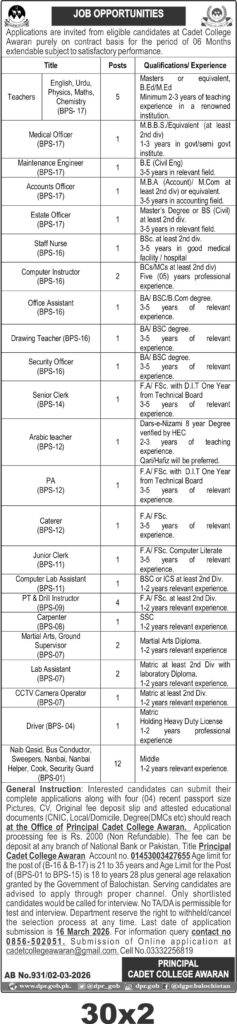 The last date for submission is **16 March 2026**. Applications must be complete with educational documents, CNIC, domicile, and four recent passport-size photographs. Submission is to be made physically at the Office of Principal, Cadet College Awaran. Interviews will be conducted for shortlisted candidates, and no TA/DA will be provided.