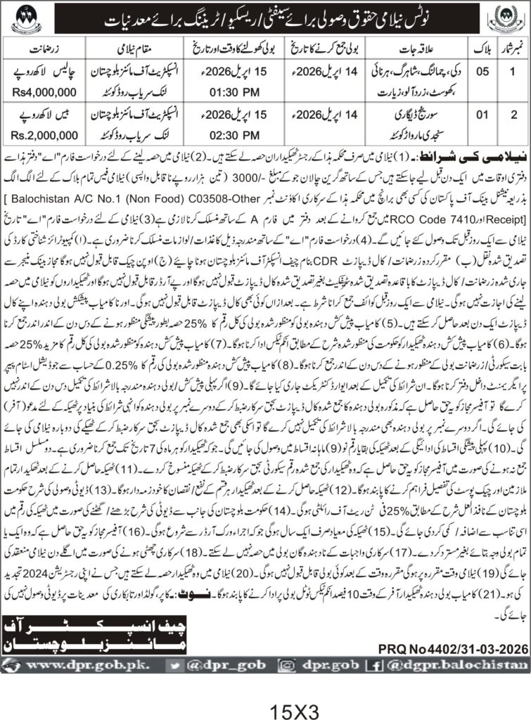 The submission deadline is set for 14th April 2026, with the technical bids opening on the same day at 1:30 PM and 2:30 PM respectively for different blocks. Bids must be submitted in sealed envelopes to the office of the Chief Inspector of Mines, Balochistan, located in Quetta. Late submissions will not be entertained.