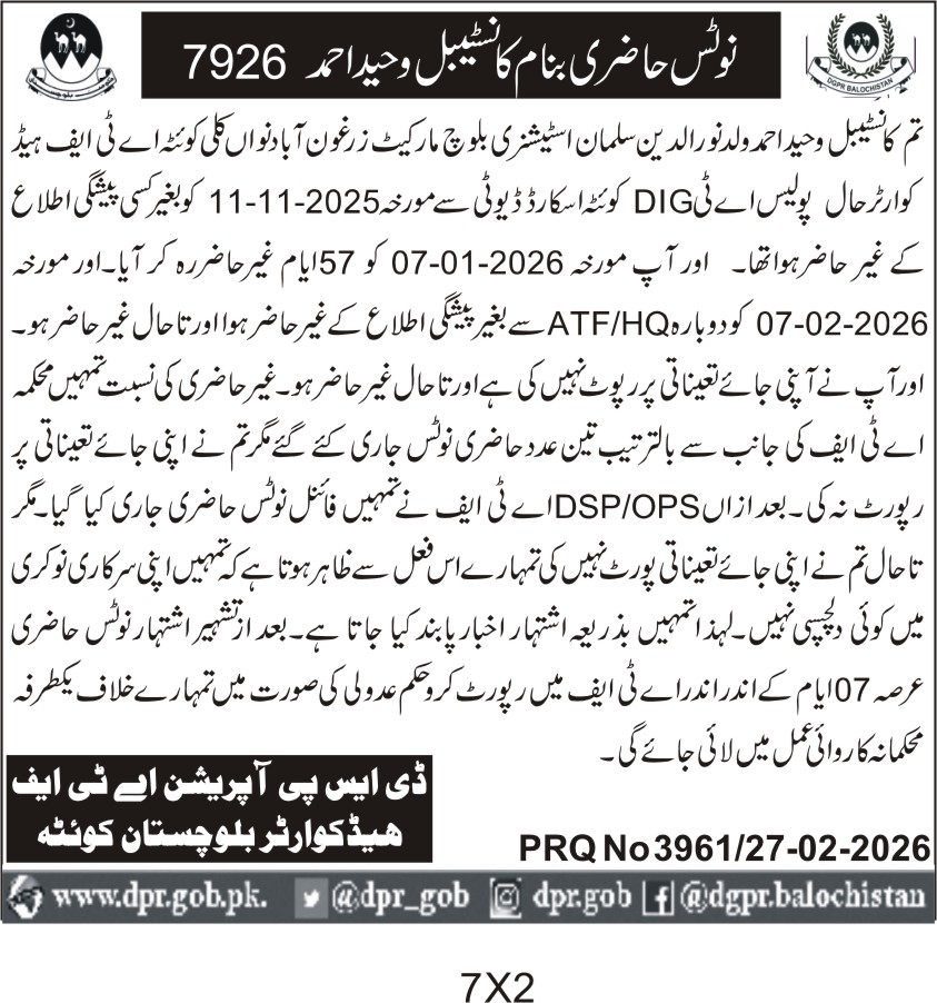 ποΈ Issuing Authority:Deputy Superintendent Police Operations, Headquarter Balochistan, Kharan