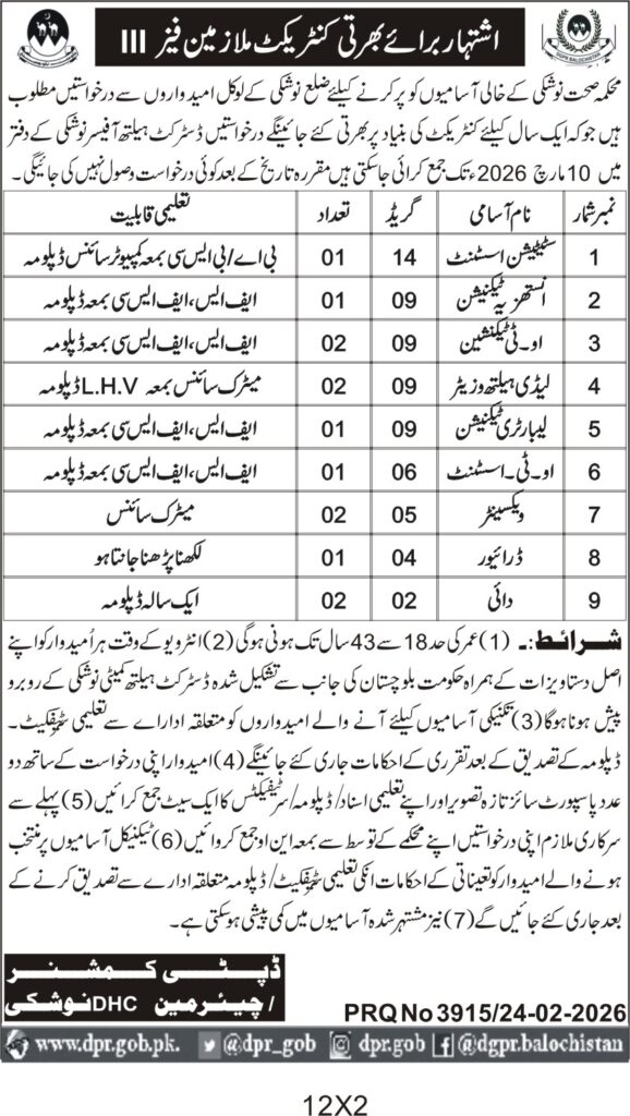 The submission deadline is set for 10th March 2026, with applications to be submitted to the office of the District Health Officer, Nushki. The technical bids will be opened on the closing date, and candidates are encouraged to submit their documents in sealed envelopes to ensure compliance with procedural requirements.