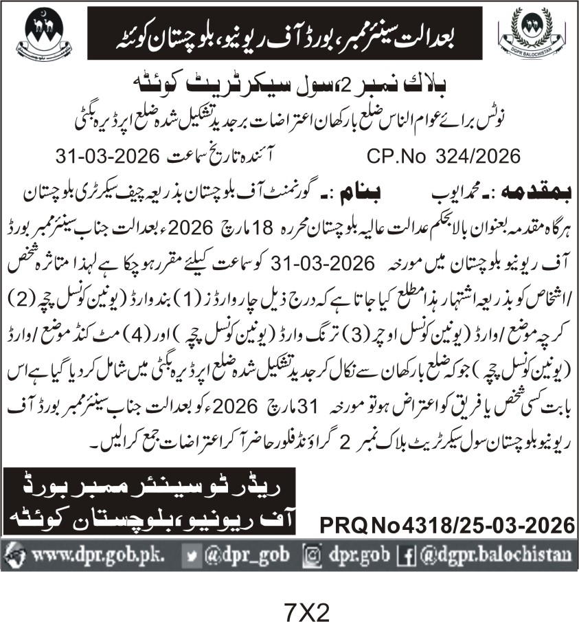 The department requires stakeholders and affected persons to submit their objections by the deadline. The notice specifies four union councils—Band Road, Tork Road, Mast Kand, and Karche Road—within the newly formed district. This process ensures transparency and public participation in district formation, a critical administrative task in Balochistan.