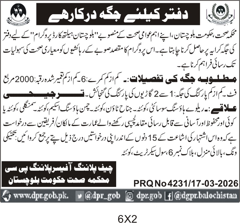 This tender invites qualified contractors in Quetta to provide office space for the Balochistan Health Department under the Balochistan Health Development Program. The department requires office space ranging from 6 to 2000 square feet, with parking facilities for 1 to 2 vehicles. The location must be in Quetta, including areas like Railway Housing Society, Kooh-e-Sabz, Janjua Town, Kooh-e-Chaman Housing Scheme, Kooh-e-Sangli, or any other safe and accessible official location.