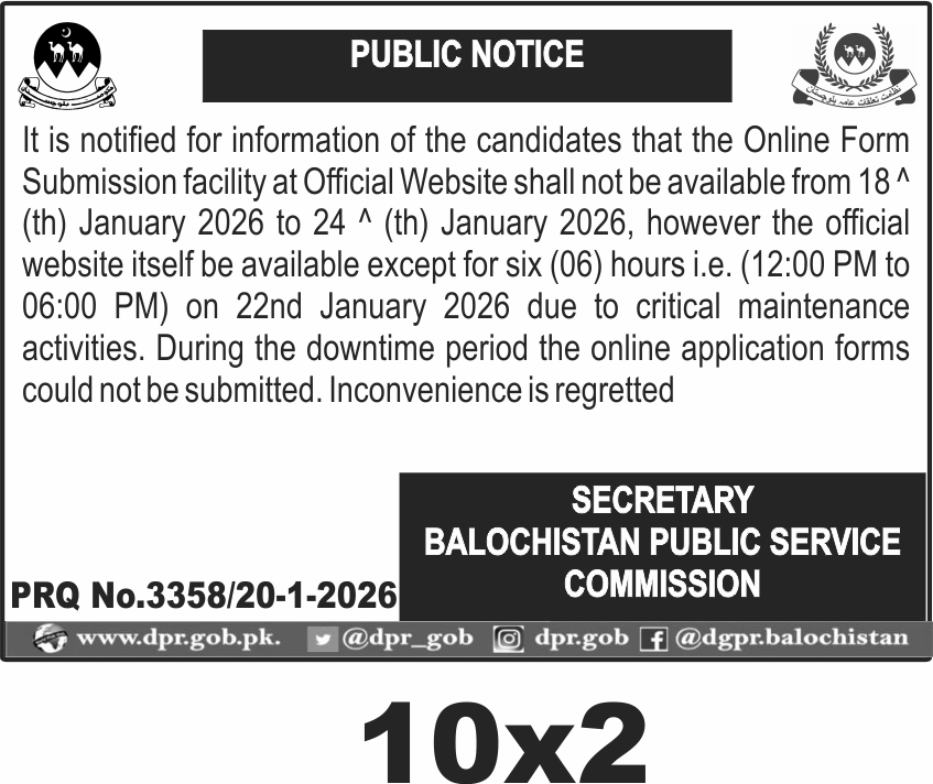 Online Form Submission Downtime Notice for Balochistan Public Service Commission