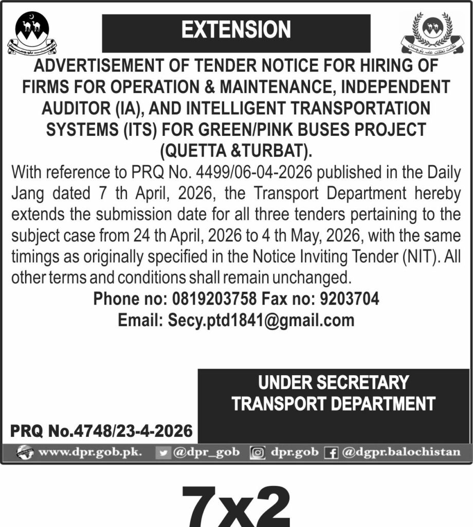 Eligible bidders should have relevant experience in transportation services, auditing, and ITS implementation. Registration with FBR and a valid ATL status are mandatory. Firms with proven track records in similar projects will be preferred. The tender submission deadline has been extended to 4th May 2026, with all terms and conditions remaining unchanged from the original notice.