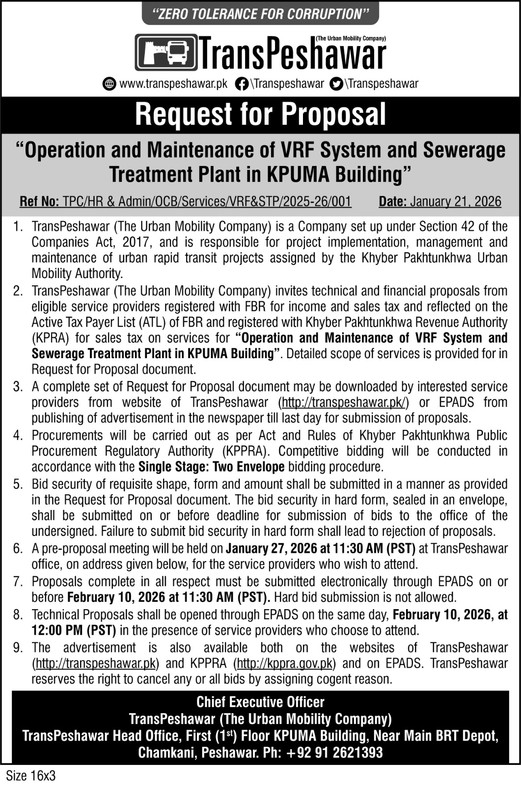 This tender from TransPeshawar (The Urban Mobility Company) in Peshawar invites qualified service providers for the operation and maintenance of the VRF system and sewerage treatment plant at the KPUMA Building. The scope covers technical and financial proposals for maintaining critical HVAC and sewerage infrastructure, ensuring smooth urban transit facility operations.