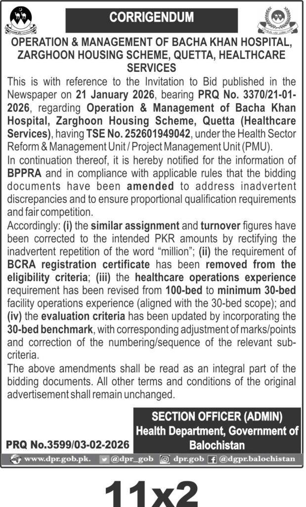 The submission deadline is set for 3rd February 2026, with bids opening thereafter. Interested parties should submit sealed bids to the Health Department office in Balochistan before the deadline. All amendments form an integral part of the bidding documents, and other terms remain unchanged.