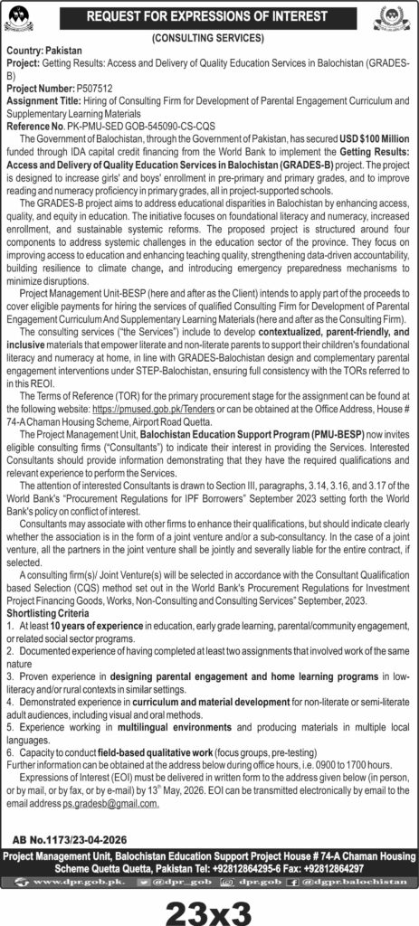 Eligible firms must demonstrate at least 10 years of relevant experience, documented completion of similar assignments, and capacity to work in rural and low-literacy contexts. The firm may be a joint venture or sub-consultancy but must clearly state the arrangement. Interested consultants should submit their Expressions of Interest (EOI) by 13th May 2026 to the Project Management Unit at House # 74-A Chaman Housing Scheme, Airport Road Quetta, or electronically via email.