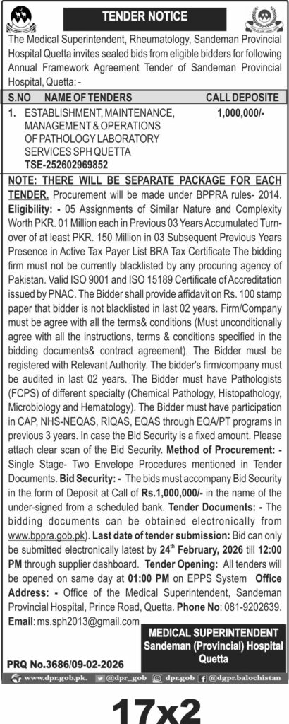 This tender from Sandeman Provincial Hospital Quetta invites bids for the establishment, maintenance, management, and operations of pathology laboratory services. Located in Quetta, the hospital seeks a qualified firm to handle comprehensive pathology services including chemical pathology, histopathology, microbiology, and hematology. The scope demands experienced professionals and adherence to high standards of laboratory operations to ensure accurate diagnostics and patient care.