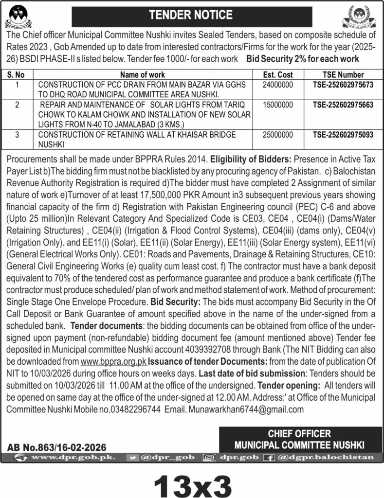 This tender from Municipal Committee Nushki in Balochistan covers major civil and electrical works including construction of a PCC drain from Main Bazar via GGHS to DHQ Road, repair and maintenance of solar lights from Tariq Chowk to Kalam Chowk, and installation of new solar lights from N-40 to Jamalabad, plus construction of a retaining wall at Khaisar Bridge. The combined estimated cost is PKR 64 million, reflecting significant infrastructure development in Nushki.