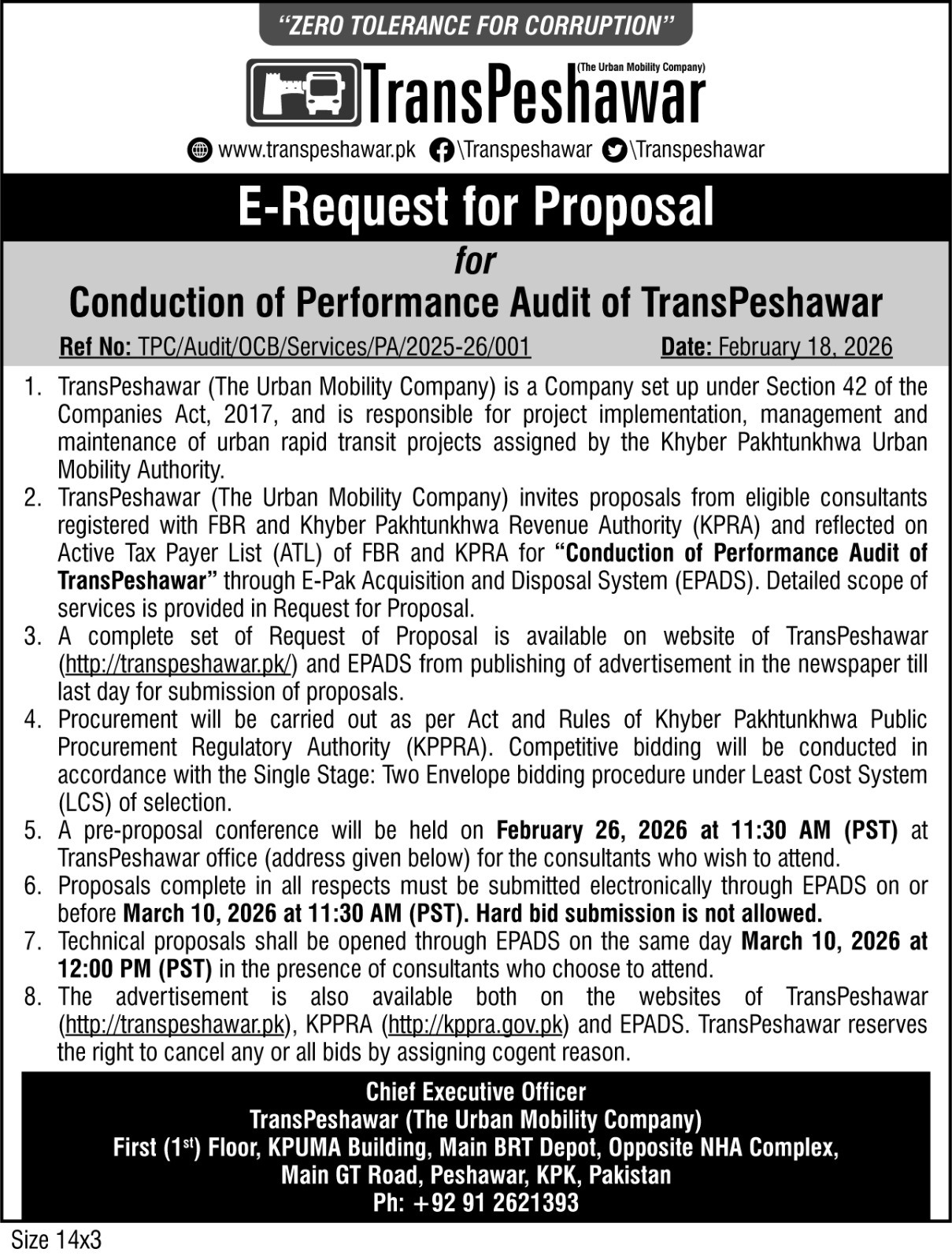 The submission deadline is set for 10th March 2026 at 11:30 AM PST, with technical bids opening the same day at 12:00 PM PST via EPADS. A pre-proposal conference is scheduled for 26th February 2026 at 11:30 AM PST at the TransPeshawar office, located at First Floor, KPUMA Building, Main BRT Depot, Opposite NHA Complex, Main GT Road, Peshawar. Proposals must be submitted electronically; hard copies are not accepted.