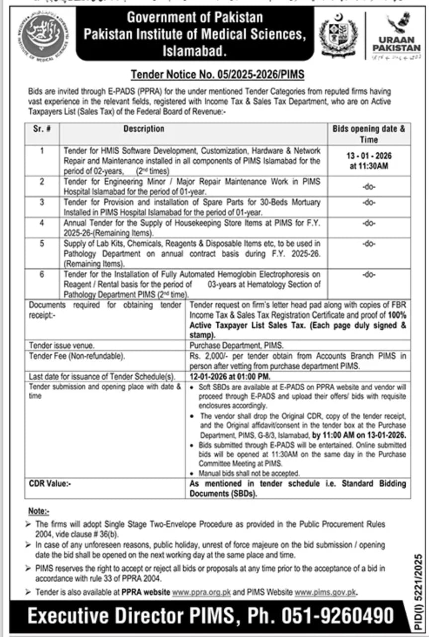 Eligible firms must be registered with income and sales tax departments and on the active taxpayer list. Tender documents are available from the Purchase Department, PIMS, with a non-refundable fee. Submission is through E-PADS with original documents dropped at the Purchase Department by the specified deadline.