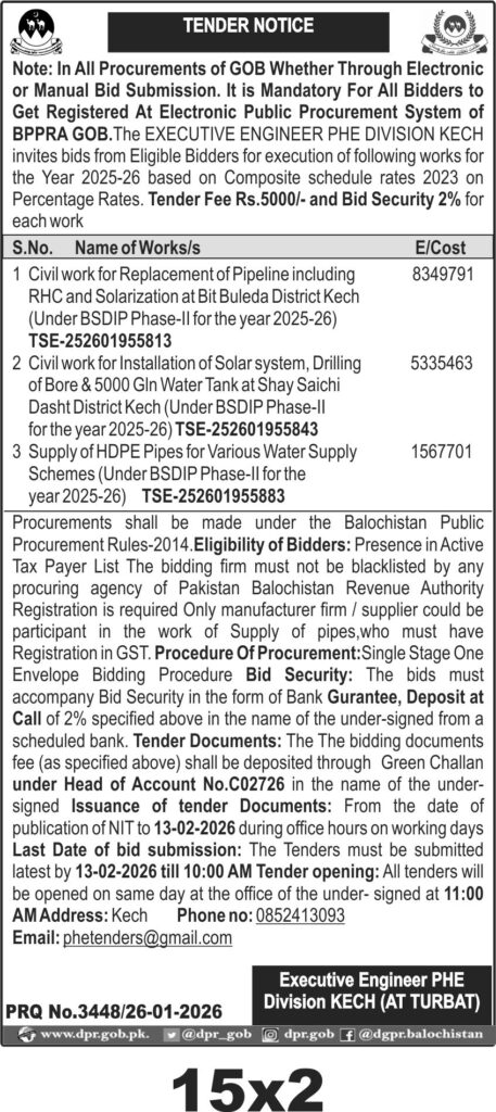 The submission deadline is set for 13th February 2026 at 10:00 AM, with bid opening scheduled the same day at 11:00 AM at the WAPDA office in Kech. Interested parties should submit sealed bids in accordance with the Single Stage One Envelope procedure. For inquiries, contact the Executive Engineer PHE Division Kech at phone 0852413093 or email phetenders@gmail.com.