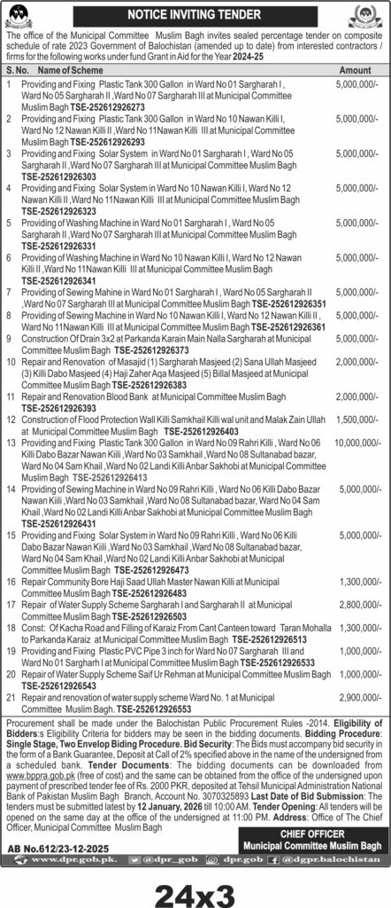 Tender documents are available for free download and can also be obtained from the office upon payment of a prescribed fee. The last date for bid submission is 12 January 2026 at 10:00 AM with opening at 11:00 AM on the same day. The procurement is conducted under Balochistan Public Procurement Rules 2014 by the Municipal Committee Muslim Bagh.