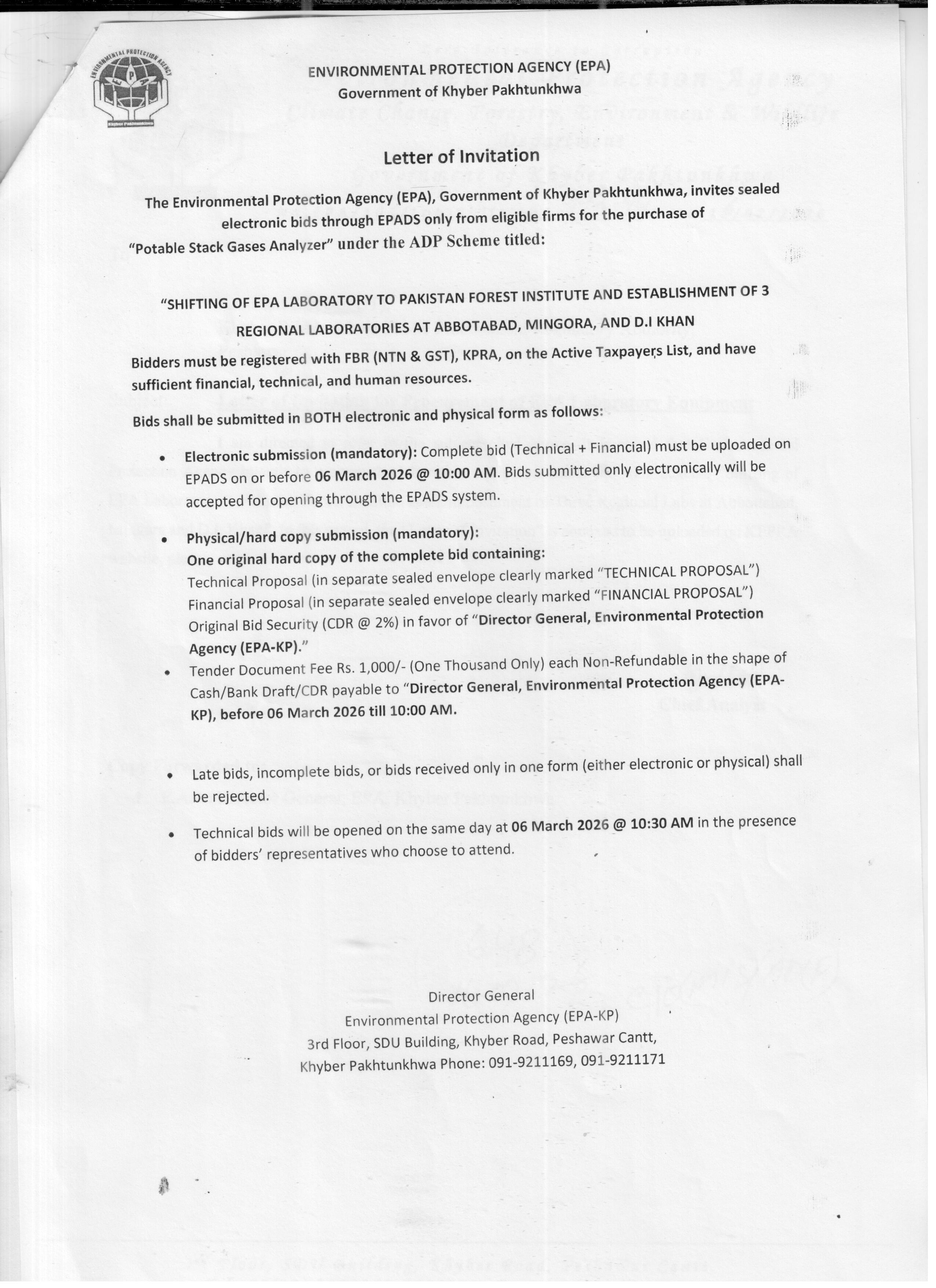 Pro-Tip: Ensure your bid includes both technical and financial proposals in separate sealed envelopes and verify the CDR is correctly addressed to the Director General, EPA-KP. Missing any component or submitting only one form of bid will lead to rejection.