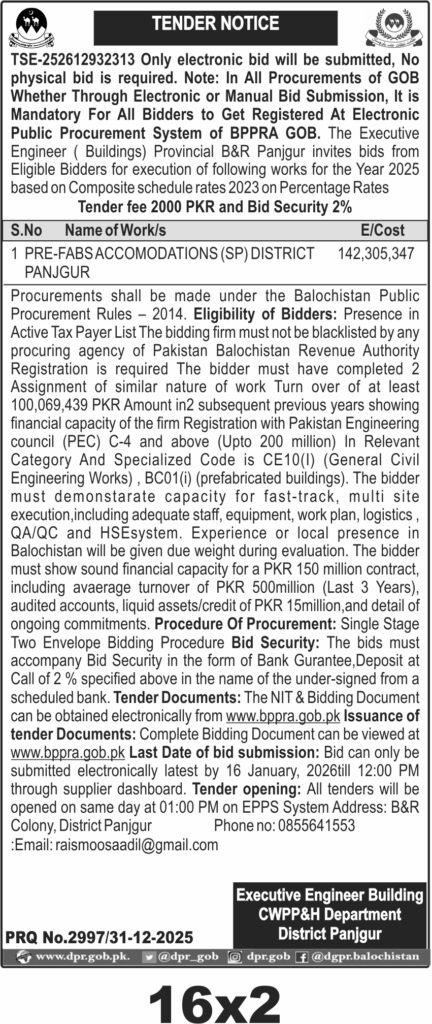 This tender invites bids for the construction of pre-fabricated accommodations in District Panjgur, Balochistan, under the Executive Engineer Building CWPP&H Department. The project falls under the construction category and involves the use of composite schedule rates 2023 on percentage basis. The estimated cost is PKR 142,305,347, with a tender fee of PKR 2000 and a bid security of 2%. The procurement is managed electronically through the BPPRA system.