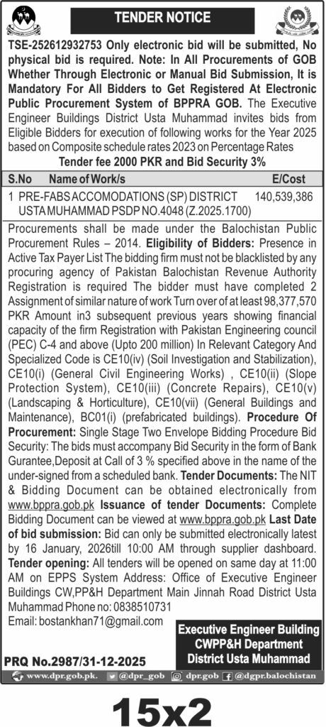 ποΈ Issuing Authority:Balochistan Public Procurement Regulatory Authority (BPPRA), Executive Engineer Buildings District Usta Muhammad