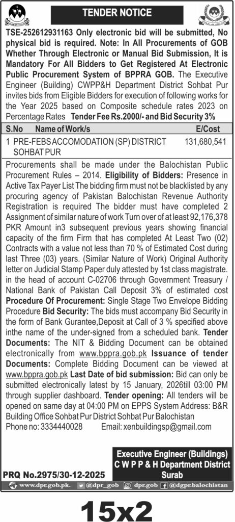This tender invites bids for the construction of pre-fabricated emergency accommodation in Sohbat Pur, Balochistan, issued by the CWPP&H Department District Sohbat Pur. The project falls under the construction category and aims to provide essential shelter facilities for the year 2025.