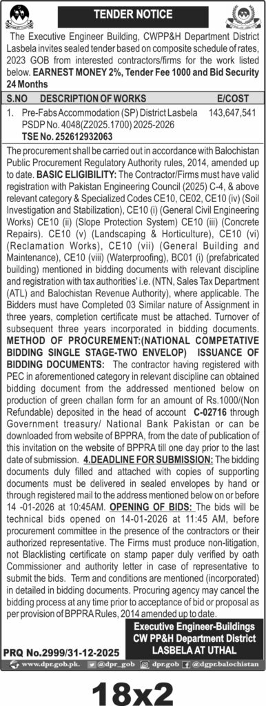 The submission deadline is set for 14th January 2026 at 10:45 AM, with technical bids opening the same day at 11:45 AM at the CWPP&H Department office in Lasbela. Bids must be submitted in sealed envelopes by hand or registered mail. The department requires non-litigation and non-blacklisting certificates duly verified by an oath commissioner.