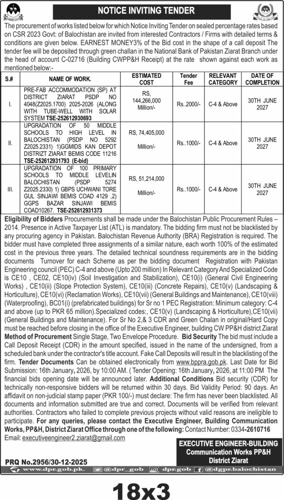 This tender invites contractors in Ziarat, Balochistan, under Building Communication Works PP&H for construction and upgradation projects in the education sector. The scope includes pre-fabricated accommodation with solar tube-well systems and upgrading middle and primary schools to higher levels. The projects demand expertise in civil engineering, prefabricated building techniques, and solar system integration, ensuring sustainable infrastructure development in the region.