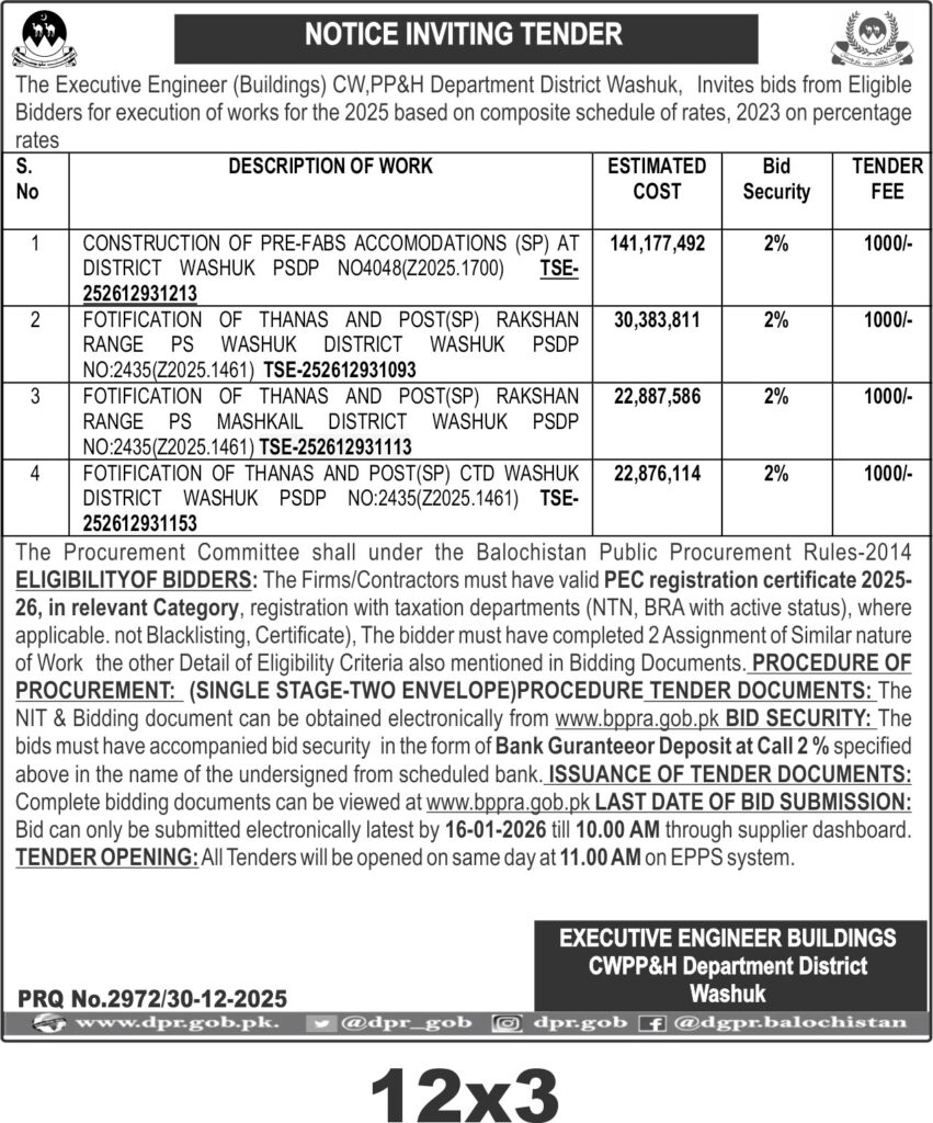 This tender invites bids from eligible contractors for the construction of pre-fabricated accommodations and fortification of police stations and posts in District Washuk, Balochistan. The CWPP&H Department District Washuk requires execution of these works based on composite schedule of rates for the year 2025. The projects include building durable pre-fabs accommodations and strengthening security infrastructure at various police posts and thanas in Washuk, ensuring enhanced safety and operational efficiency.