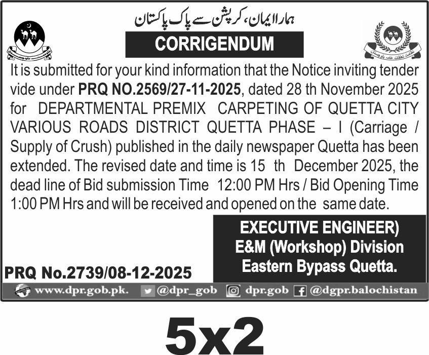 The scope includes supply and application of premix carpet materials on various roads in Quetta district, Phase I. The tender was originally published on 28 November 2025 and has been extended to 15 December 2025. Bids must be submitted by 12:00 PM with opening at 1:00 PM on the same day.