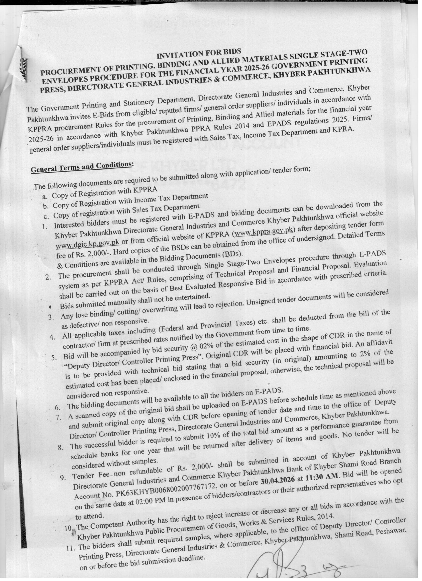 The Directorate General Industries and Commerce, Khyber Pakhtunkhwa, invites bids for the procurement of printing, binding, and allied materials for the financial year 2025-26. This procurement is specifically for the Government Printing Press located in Peshawar, Khyber Pakhtunkhwa. The scope includes a variety of printing and binding materials required to support government printing needs throughout the year.