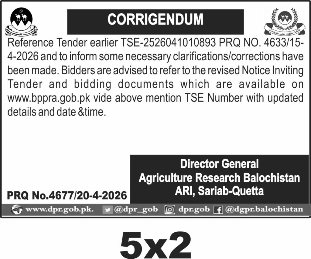 Corrigendum for Tender Reference TSE-2526031009043 and Related PRQs by Agriculture Research Balochistan...