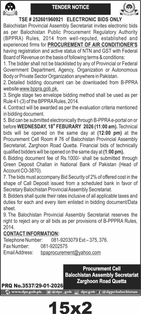 The deadline for electronic bid submission is set for 18th February 2026 at 11:00 am via the BPPRA e-portal. Technical bids will be opened the same day at 12:00 pm in the Procurement Cell Room #76 at the Secretariat on Zarghoon Road, Quetta. Financial bids of technically qualified bidders will follow at 1:00 pm. Interested parties should prepare their bids accordingly and ensure timely submission.