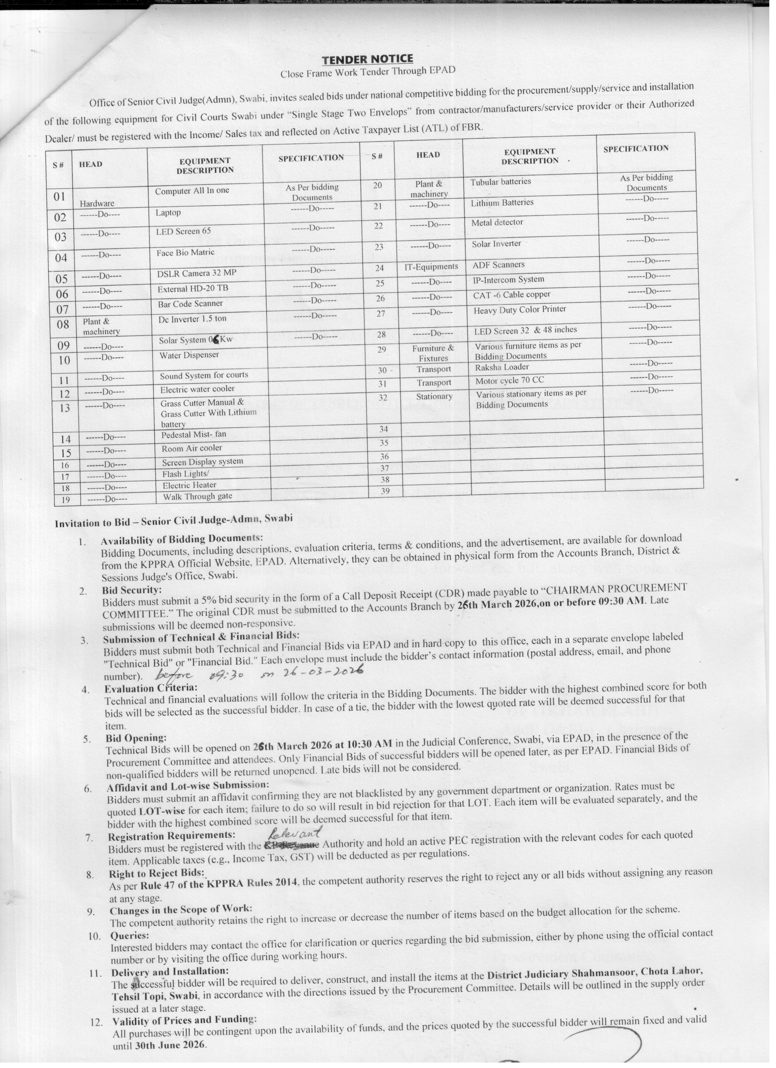 This procurement opportunity in Swabi by the Office of Senior Civil Judge (Admn) involves a diverse range of equipment including hardware like computers, laptops, LED screens, biometric devices, DSLR cameras, and IT peripherals. It also covers plant and machinery such as solar systems, water dispensers, and air coolers, along with furniture, transport vehicles, and stationary items. The tender aims to equip the Civil Courts Swabi with modern technology and essential office infrastructure.