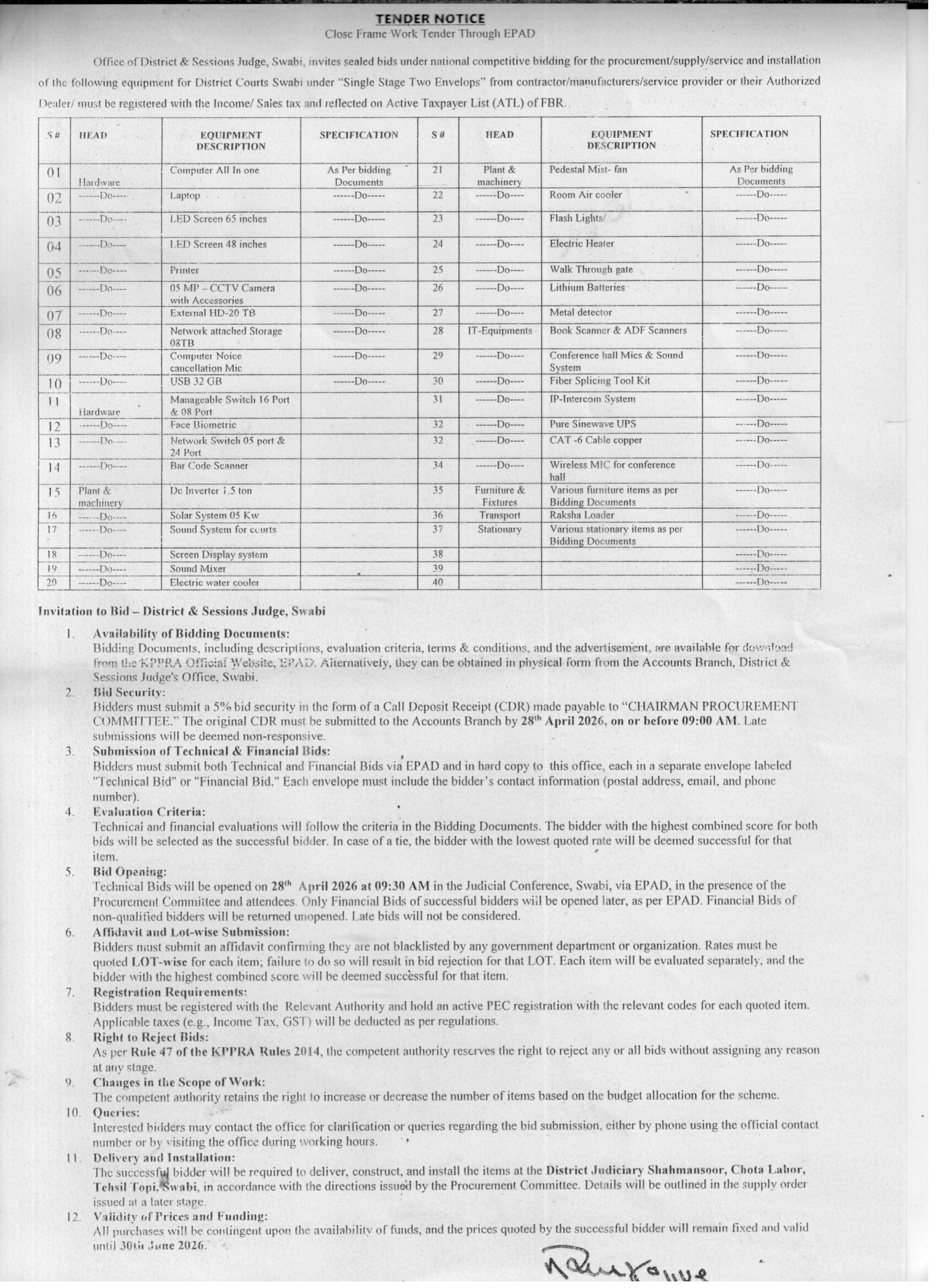 This tender invites bids for the procurement and installation of various IT hardware and related equipment at the District Courts in Swabi, Khyber Pakhtunkhwa. The Office of District & Sessions Judge, Swabi, requires items including computers, laptops, LED screens, CCTV cameras, network storage, biometric devices, solar systems, and furniture among others, to enhance the operational efficiency of the courts.
