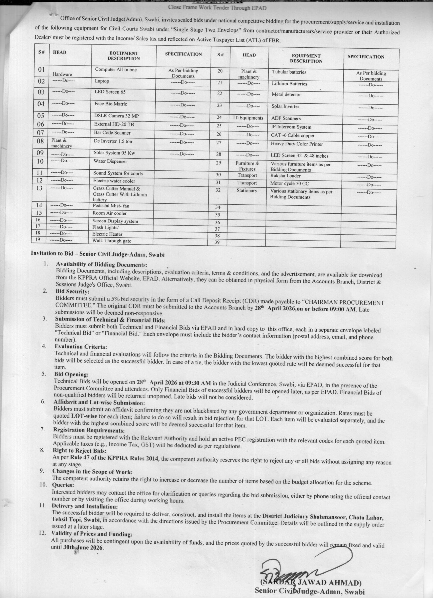 This tender invites bids from qualified contractors and suppliers in Swabi for the procurement and installation of a wide range of equipment including IT hardware, plant and machinery, furniture, transport vehicles, and stationery for Civil Courts. The Office of Senior Civil Judge (Admn) Swabi is overseeing this procurement under a single stage two envelope bidding process.