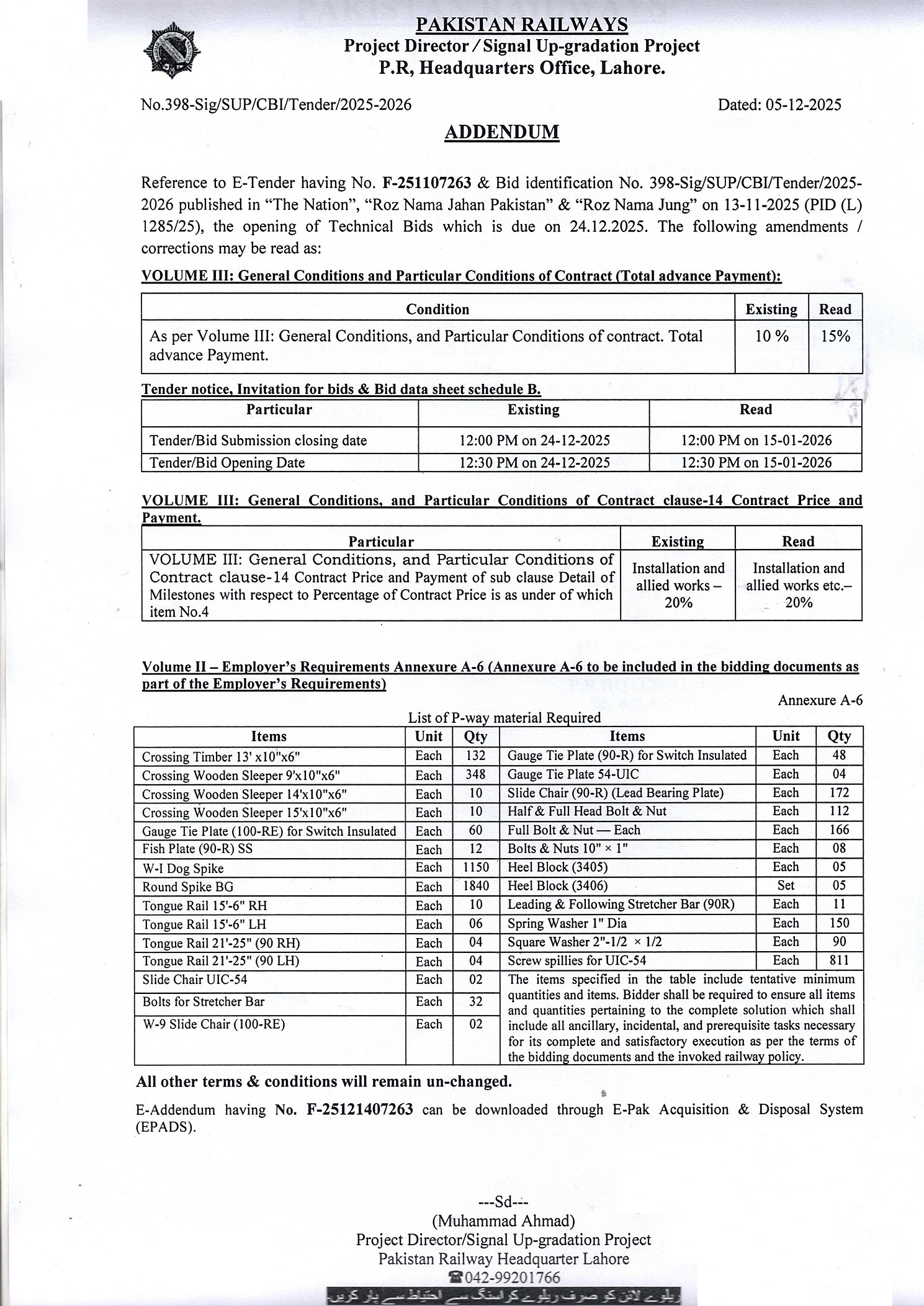 This tender concerns the procurement of various permanent way (P-way) materials required for the Signal Up-gradation Project under Pakistan Railways. The materials include timber, wooden sleepers, gauge tie plates, fish plates, spikes, bolts, washers, and other related railway track components.