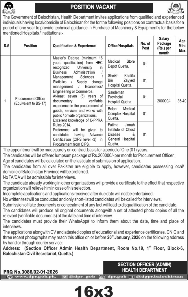The position requires a Master's degree in Business Administration, Management Sciences, Statistics, Economics, Engineering, or Commerce, with at least five years of verifiable experience in procurement of goods, services, and works. The officer will provide technical guidance for machinery and equipment purchases at key hospitals including Medical Store Depot, Sheikh Khalifa Bin Zayyed Hospital, Sandeman Provincial Hospital, Bolan Medical Complex, and Fatima Jinnah Institute of Chest Disease. The contract is for one year, emphasizing local domicile preference and practical knowledge of BPPRA rules.
