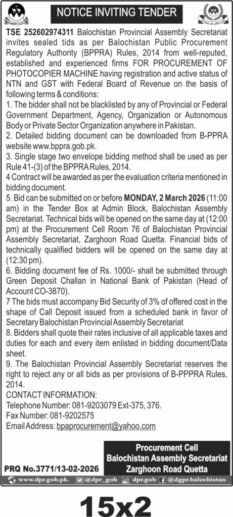This tender invites bids from reputable firms for the procurement of a photocopier machine for the Balochistan Provincial Assembly Secretariat in Quetta. The department requires a reliable and efficient photocopier to support its administrative functions, ensuring smooth document handling and processing within the Secretariat.