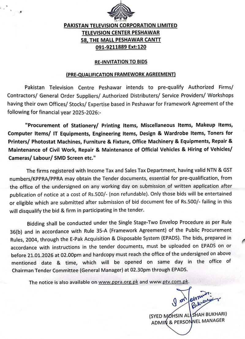 This tender from Pakistan Television Corporation (PTV), Television Center Peshawar, invites pre-qualification of authorized firms and service providers based in Peshawar for a framework agreement covering multiple categories including stationery, printing items, makeup items, computer and IT equipment, engineering items, design and wardrobe items, toners for printers, photostat machines, furniture, office machinery, civil work repair, vehicle maintenance, and related services.