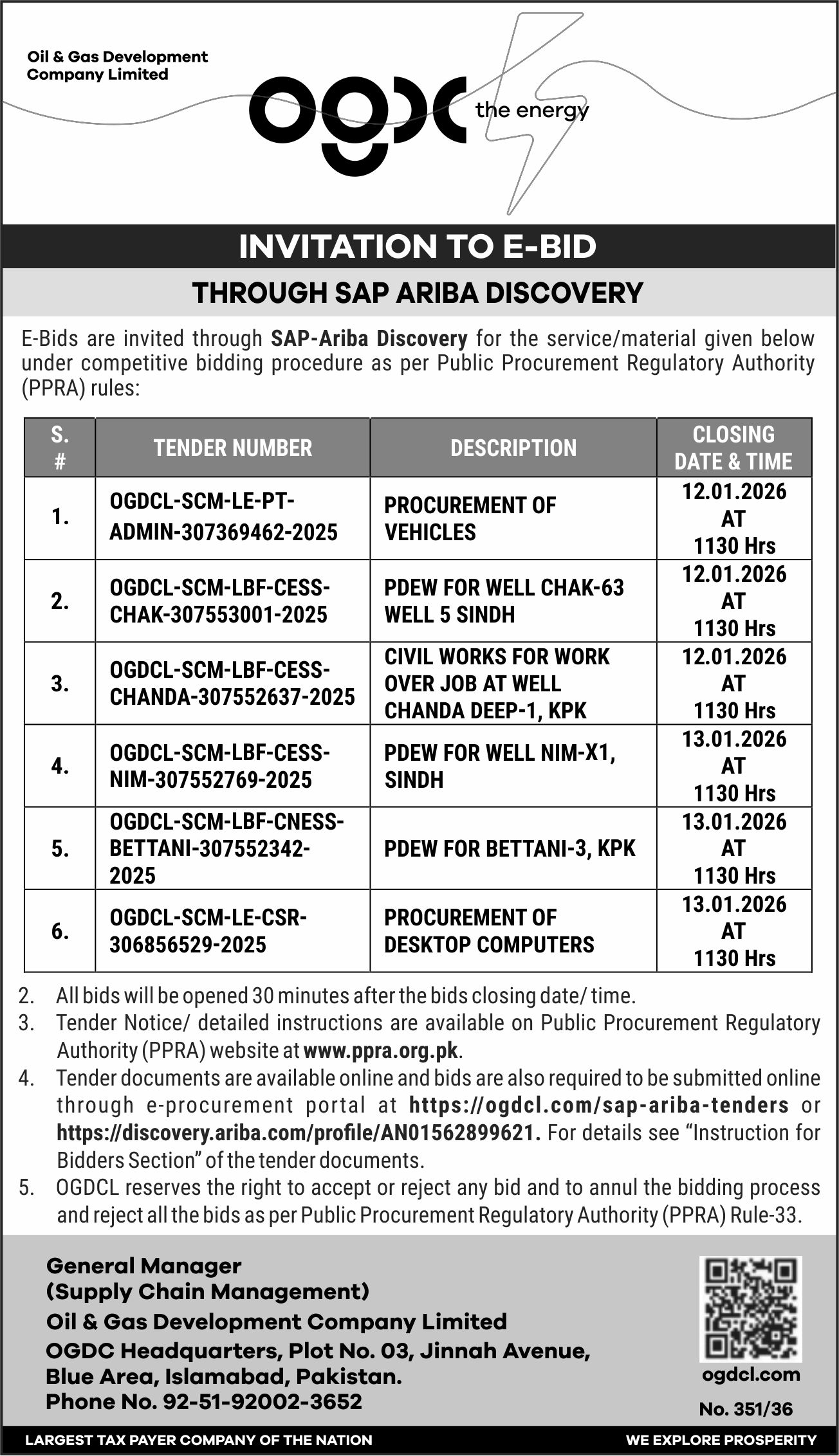 Tender documents and instructions are available online at OGDCL and PPRA websites. Bids will be opened 30 minutes after closing time. Contact details and submission guidelines are provided by OGDCL headquarters in Islamabad.