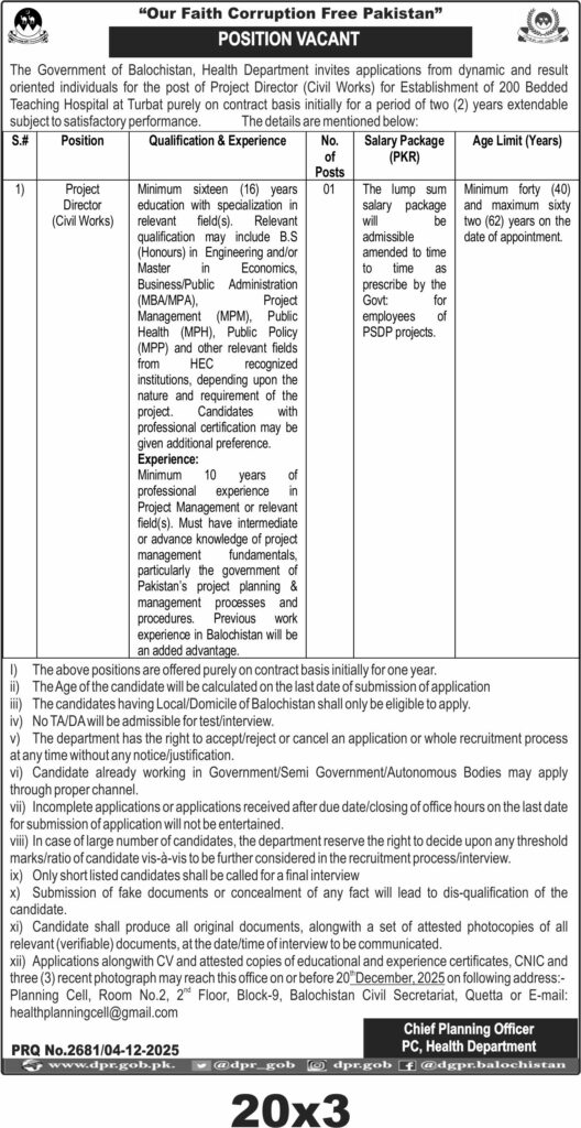 The Health Department of Government of Balochistan seeks applications for Project Director Civil Works for establishing a 200 bedded teaching hospital in Turbat. This tender covers recruitment of a qualified project director for civil works in Balochistan.