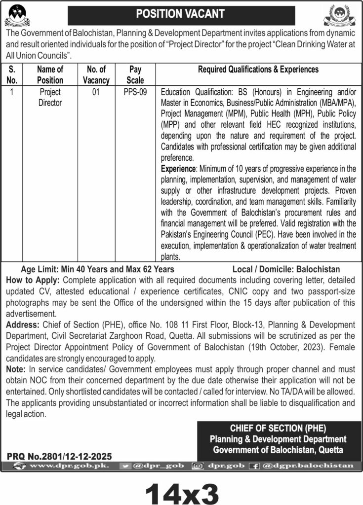 The Government of Balochistan invites applications for the position of Project Director for the Clean Drinking Water project at all Union Councils in Quetta. This consultancy role requires expertise in project management and water infrastructure development.