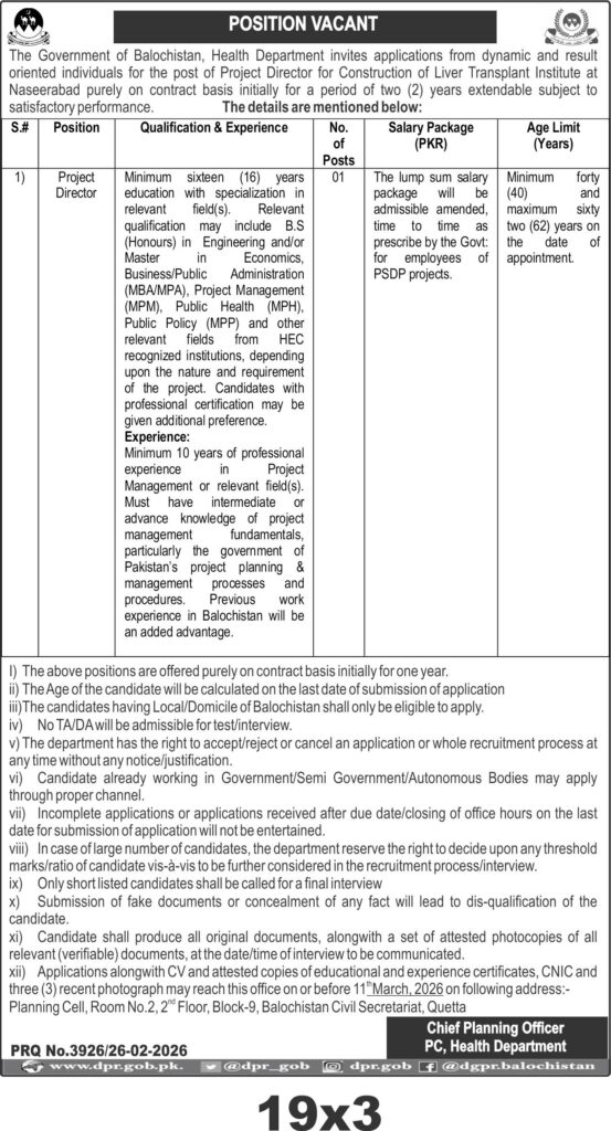 This opportunity in Quetta comes from the Balochistan Health Department seeking a Project Director for the construction of a Liver Transplant Institute at Naseerabad. The role falls under consultancy services, focusing on project management and specialized oversight for a critical healthcare infrastructure project.
