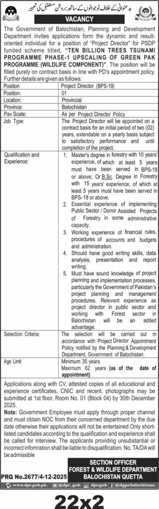 The Forest & Wildlife Department Balochistan seeks a Project Director for the Ten Billion Trees Tsunami Programme Phase-1 in Quetta. This consultancy involves managing the upscaling of the Green Pak Programme's wildlife component.