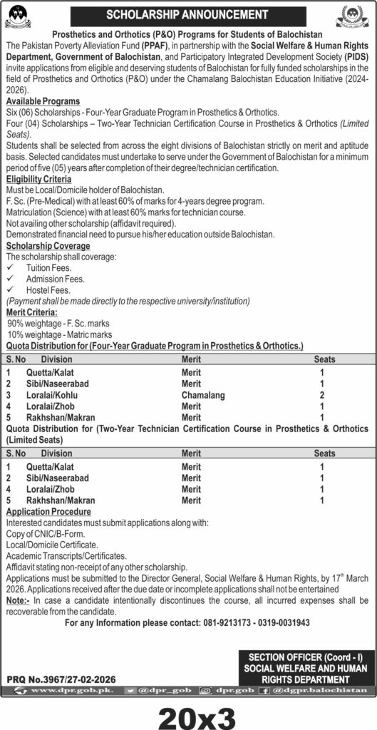 This announcement from the Social Welfare and Human Rights Department, Government of Balochistan, invites applications for fully funded scholarships in Prosthetics and Orthotics for students across Balochistan. The program offers six scholarships for a four-year graduate degree and four scholarships for a two-year technician certification course, aimed at developing skilled professionals in this vital healthcare sector in Quetta and other divisions.