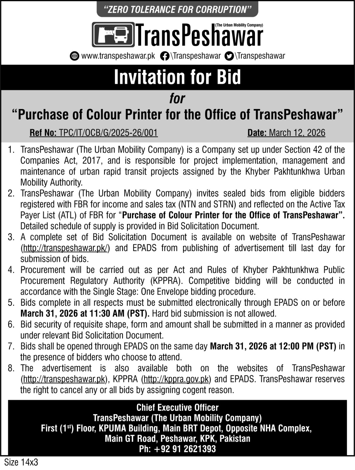 This procurement opportunity in Peshawar is issued by TransPeshawar (The Urban Mobility Company) for acquiring a colour printer to support their office operations under the IT & Office Equipment category. The tender invites bids from eligible suppliers registered with FBR and listed on the Active Taxpayer List (ATL).